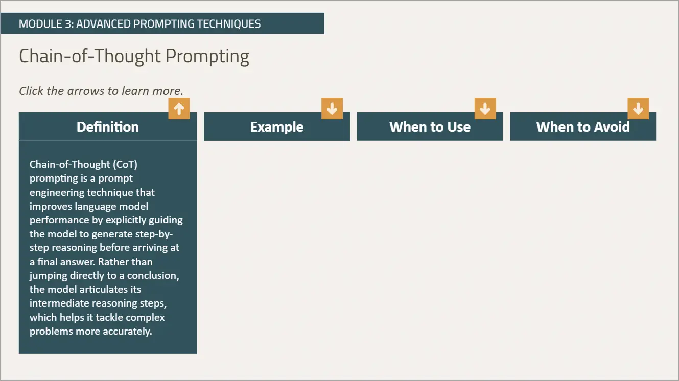 ✓ Ability to apply advanced prompting techniques to professional workflows.